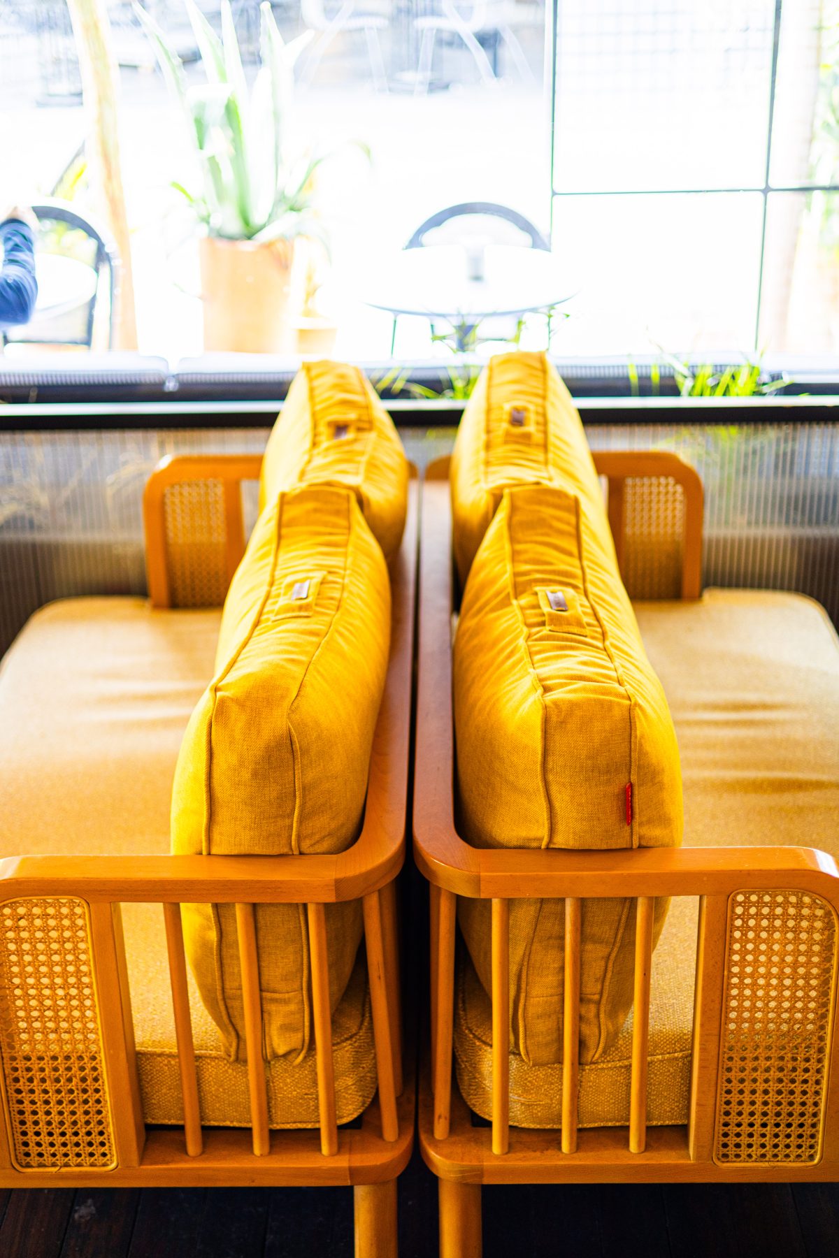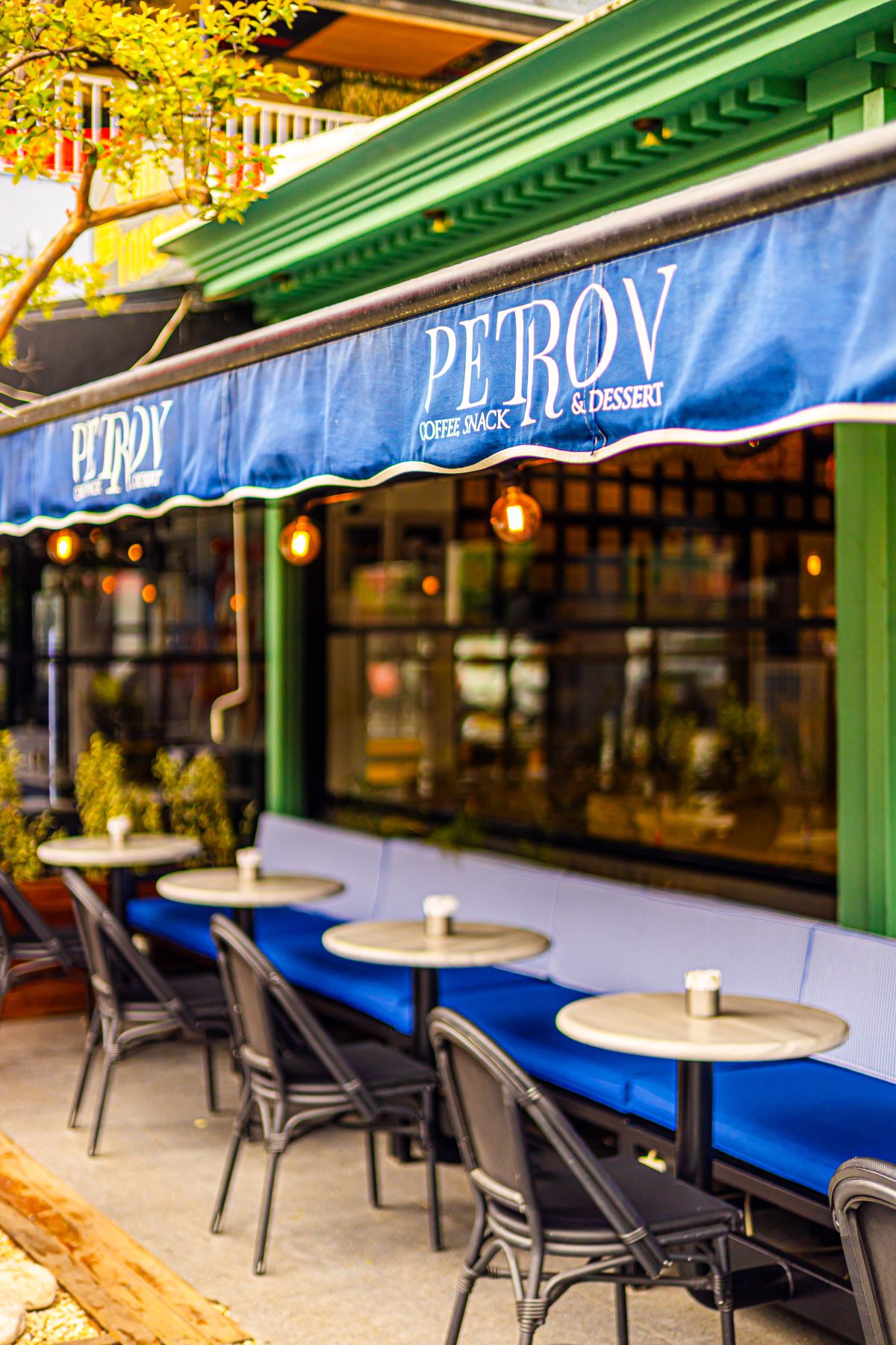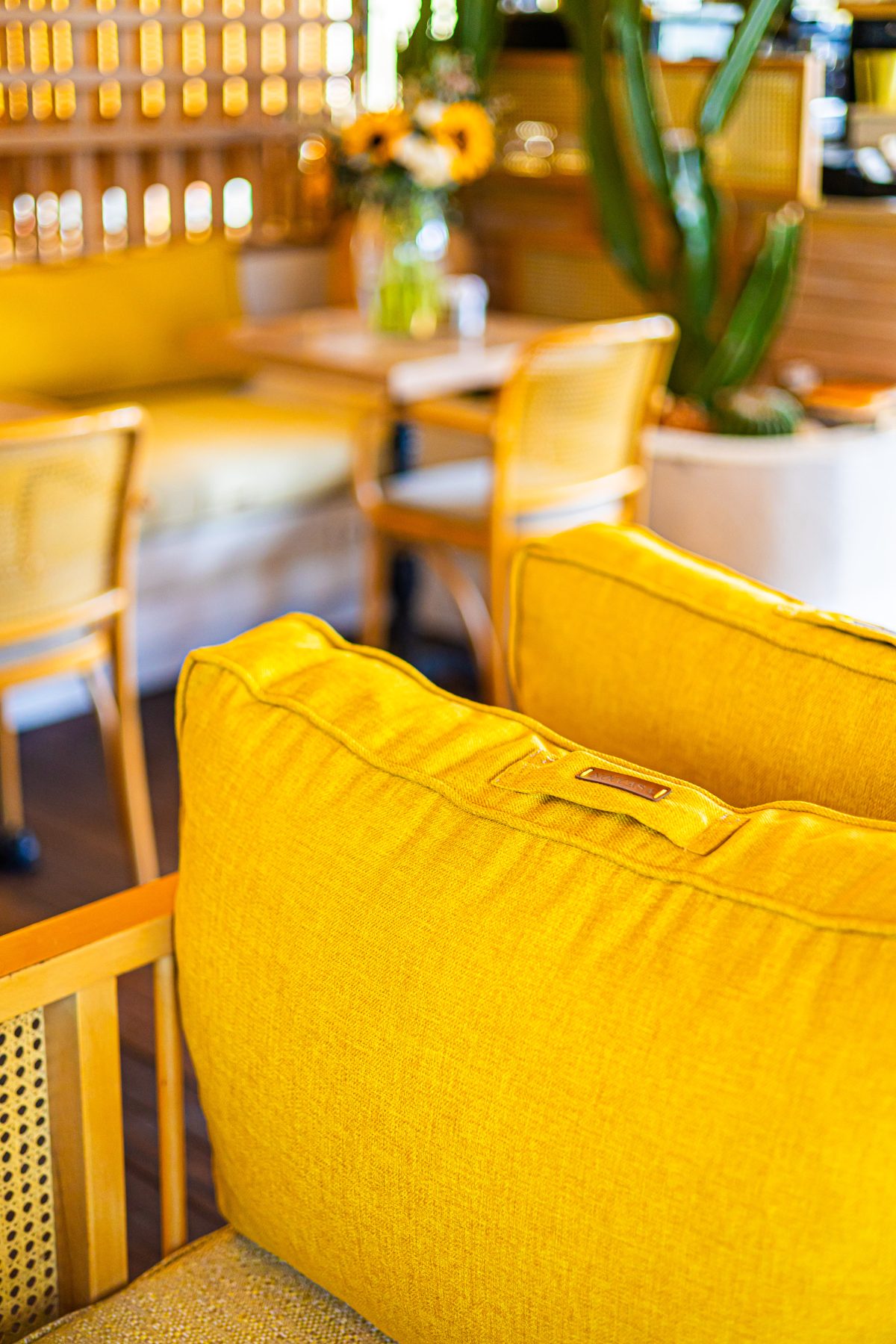 Dış mekânda mavi tonlu oturumlar, yeşil doğrama detayları ve metal strüktürle birlikte sokakla güçlü bir bağ kurarken; iç mekânda bu hikâye sarı ve hardal tonlarıyla devam ediyor. Doğal ahşap yüzeyler, hasır aydınlatmalar ve bitkilerle desteklenen renk paleti, mekânın samimi ve davetkâr karakterini güçlendiriyor.